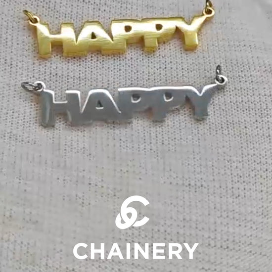 Der HAPPY-Schriftzug ist präzise lasergeschnitten und handveredelt – wahlweise 18K vergoldet oder im hochpolierten Silber-Look. Minimalistisch im Design, aber groß in der Wirkung – wie ein Sonnenstrahl zum Umhängen.