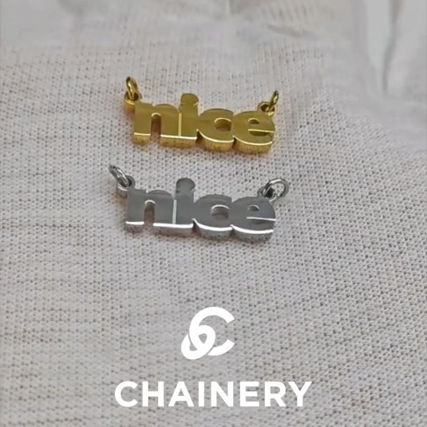 Der nice-Schriftzug ist präzise lasergeschnitten und handveredelt – wahlweise 18K vergoldet oder im hochpolierten Silber-Look. Clean, cool, tragbar – ein Statement, das nicht schreit, sondern wirkt.