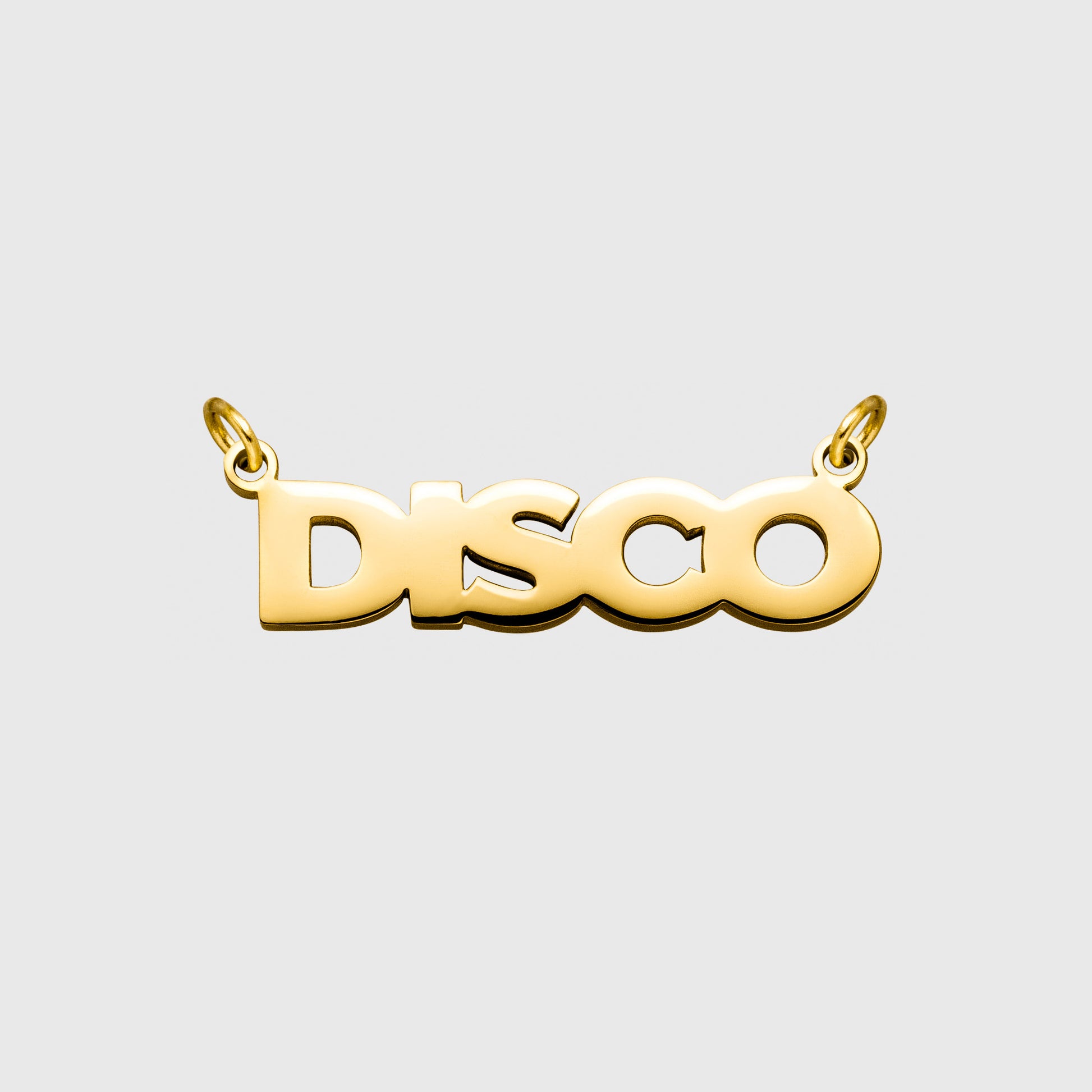 Der DISCO-Schriftzug ist präzise lasergeschnitten und handveredelt – wahlweise 18K vergoldet oder im hochpolierten Silber-Look. Die klare Typografie trifft auf maximalen Effekt: glänzend, edgy, einzigartig.