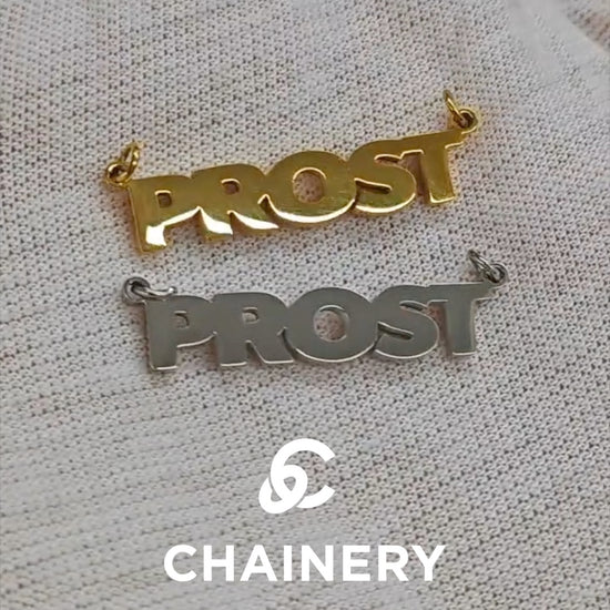 Der PROST-Schriftzug ist präzise lasergeschnitten und handveredelt – wahlweise 18K vergoldet oder im hochpolierten Silber-Look. Sauber in der Linie, stark in der Botschaft – ein Charm für alle, die wissen, wann man die Gläser hebt.