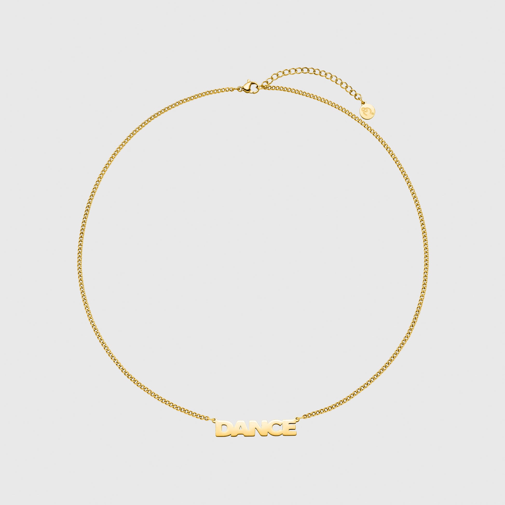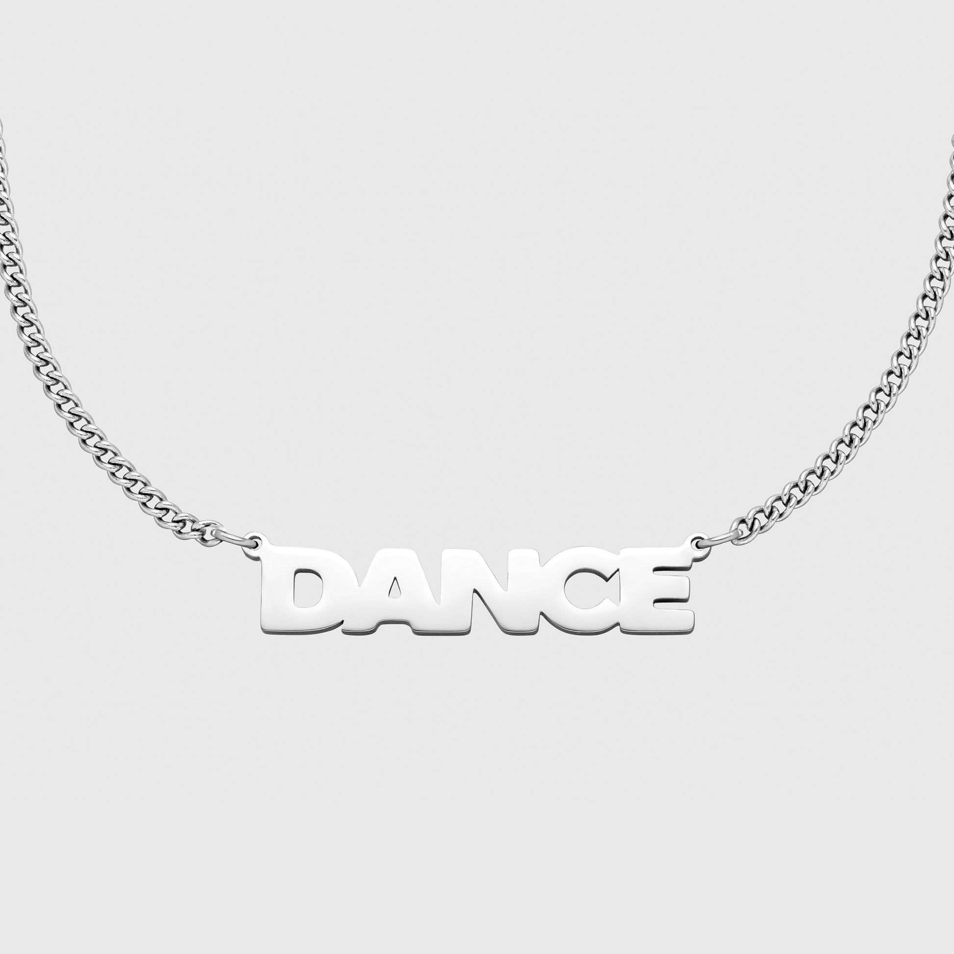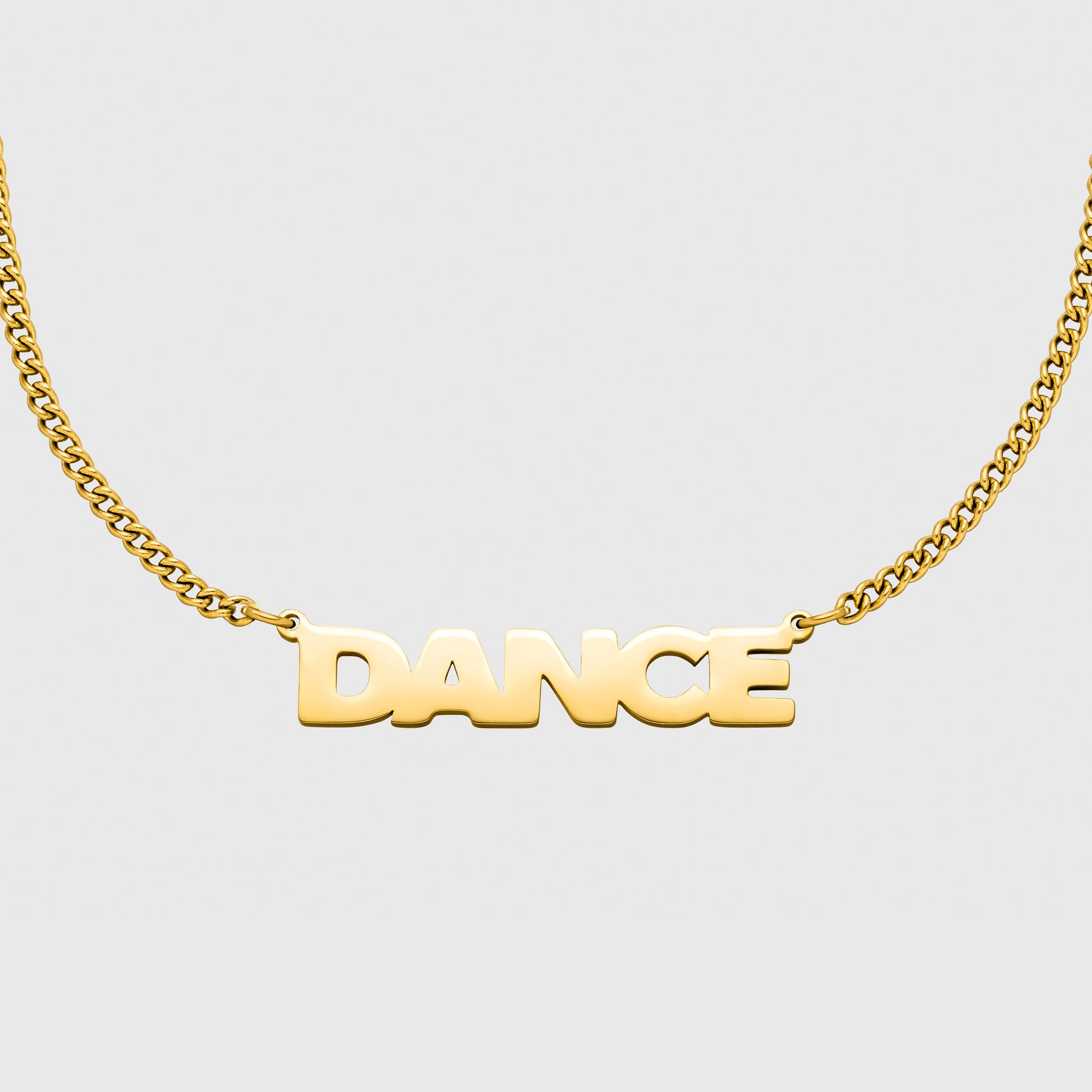 Die hochwertige Halskette mit DANCE-Schriftzug ist handveredelt und in vergoldeter oder hochpolierter Variante erhältlich. Mit klarer Typografie und modernem Design ist sie das perfekte Accessoire für Nachteulen, Tänzer:innen und Kampftänzer.